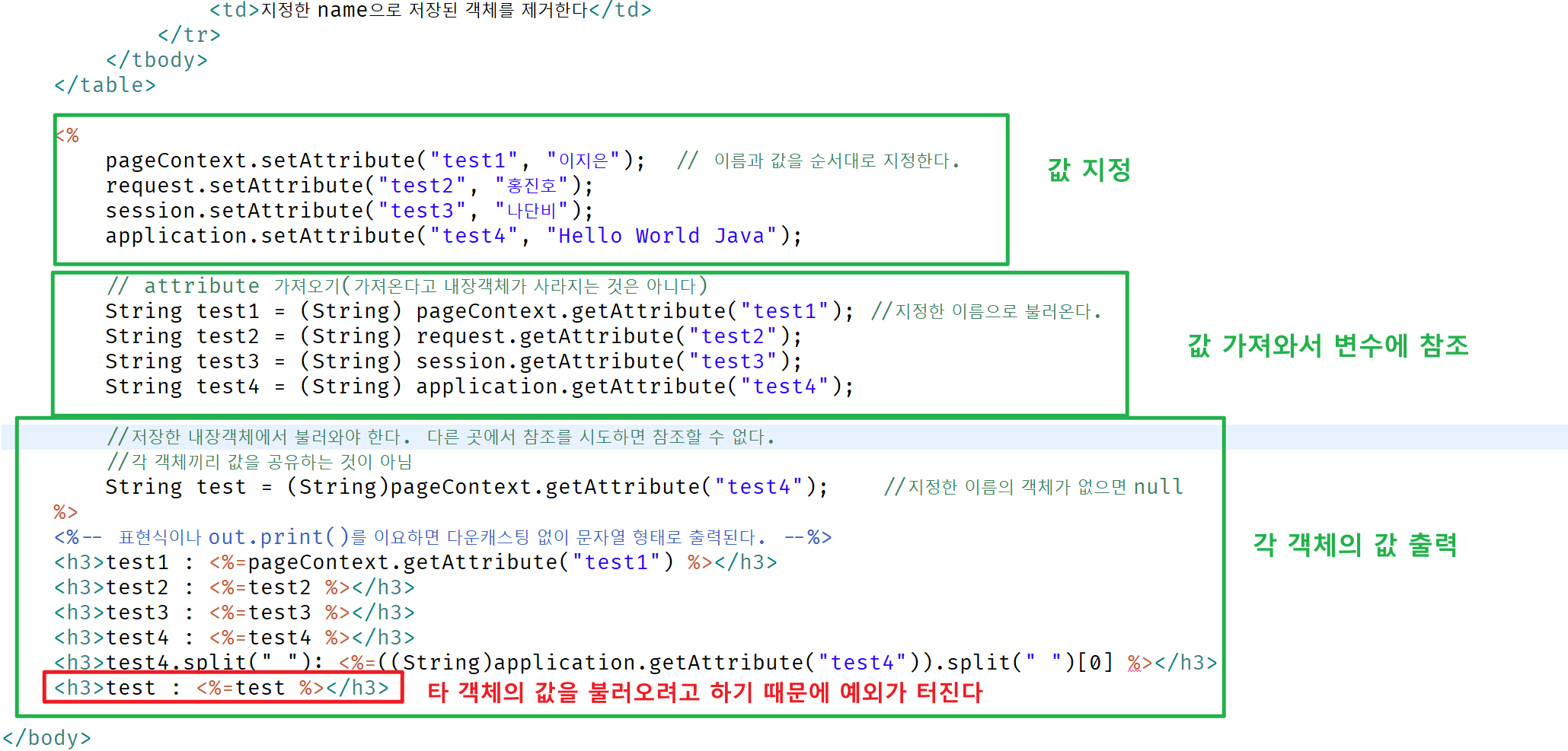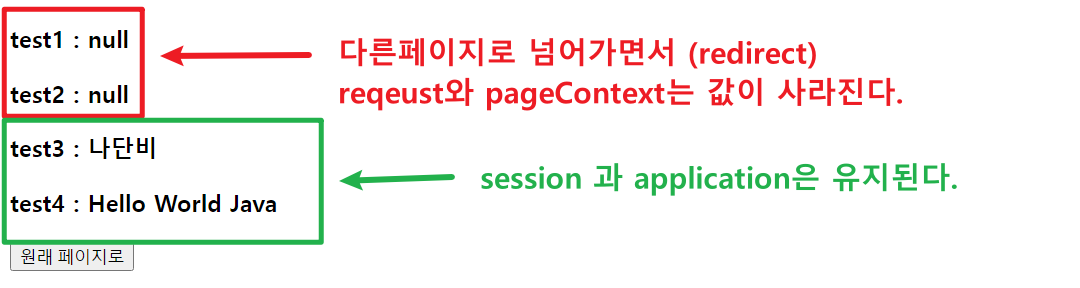 jsp페이지를 열어서 다른 페이지로 넘어갈때 어떤 객체의 값이 유지되고 어떤 객체의 값이 사라지는지 잘 살펴보세요.