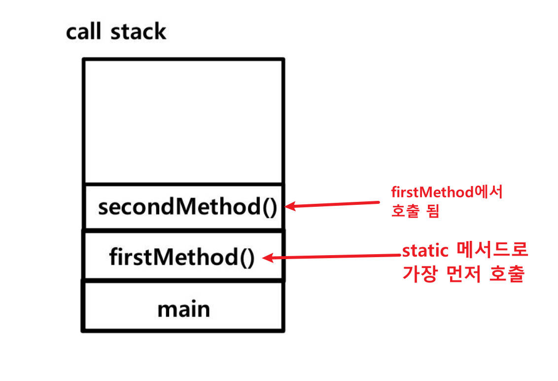 class CallStackTest{ public static void main(String[] args) { firstMethod(); } static void firstMethod() { secondMethod(); } static void secondMethod() { System.out.println("secondMethod()"); } }아래와 같이