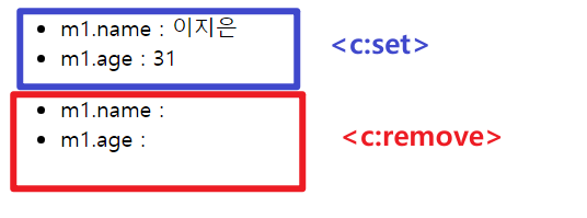 동일하지만 c:set이 아닌 c:remove를 사용하여 값을 제거합니다. 이때 해당 객체에 있는 값을 모두 제거합니다.<c:remove var="m1" scope="page"/> <!-- removeAttribute와 동일 --> <ul> <li>m1.name : ${m1.name}</li> <li>m1.age : ${m1.age }</li> </ul>