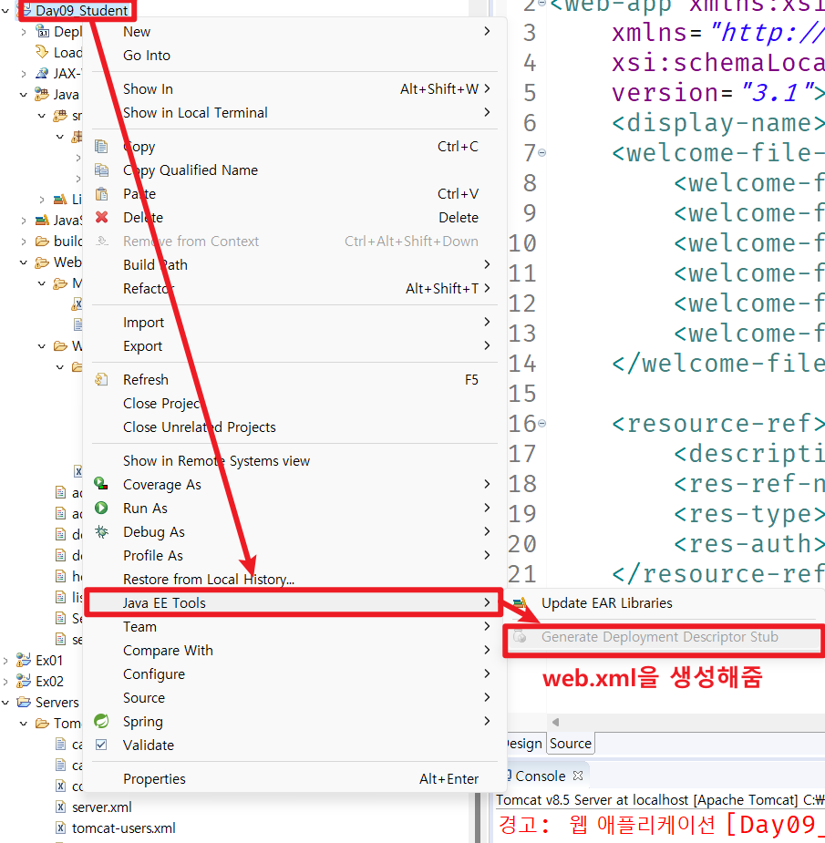 📌web.xml이 보이지 않거나 직접 만들고 싶다면? 해당 프로젝트 우클릭 > java EE tools > generate deployment ... 을 클릭해줍니다. * 저는 이미 파일이 있기에 클릭이 되지 않습니다.