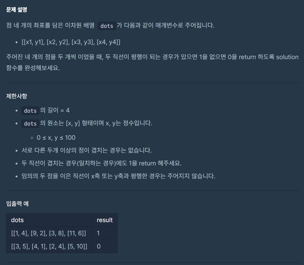 | 120875. 평행 (자바) 문제에 함정이 있습니다 꼭 읽어보세요! (0) | 2023.08.06 |