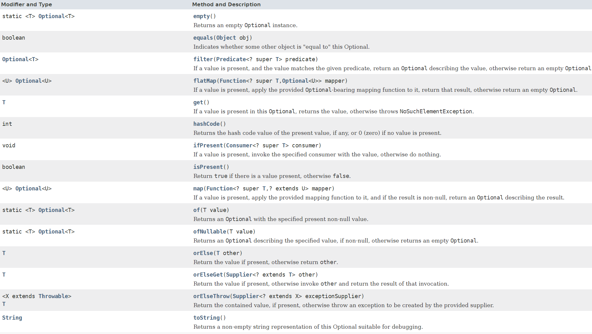 Optional의 메서드들 (Java8 공식 문서 참조)