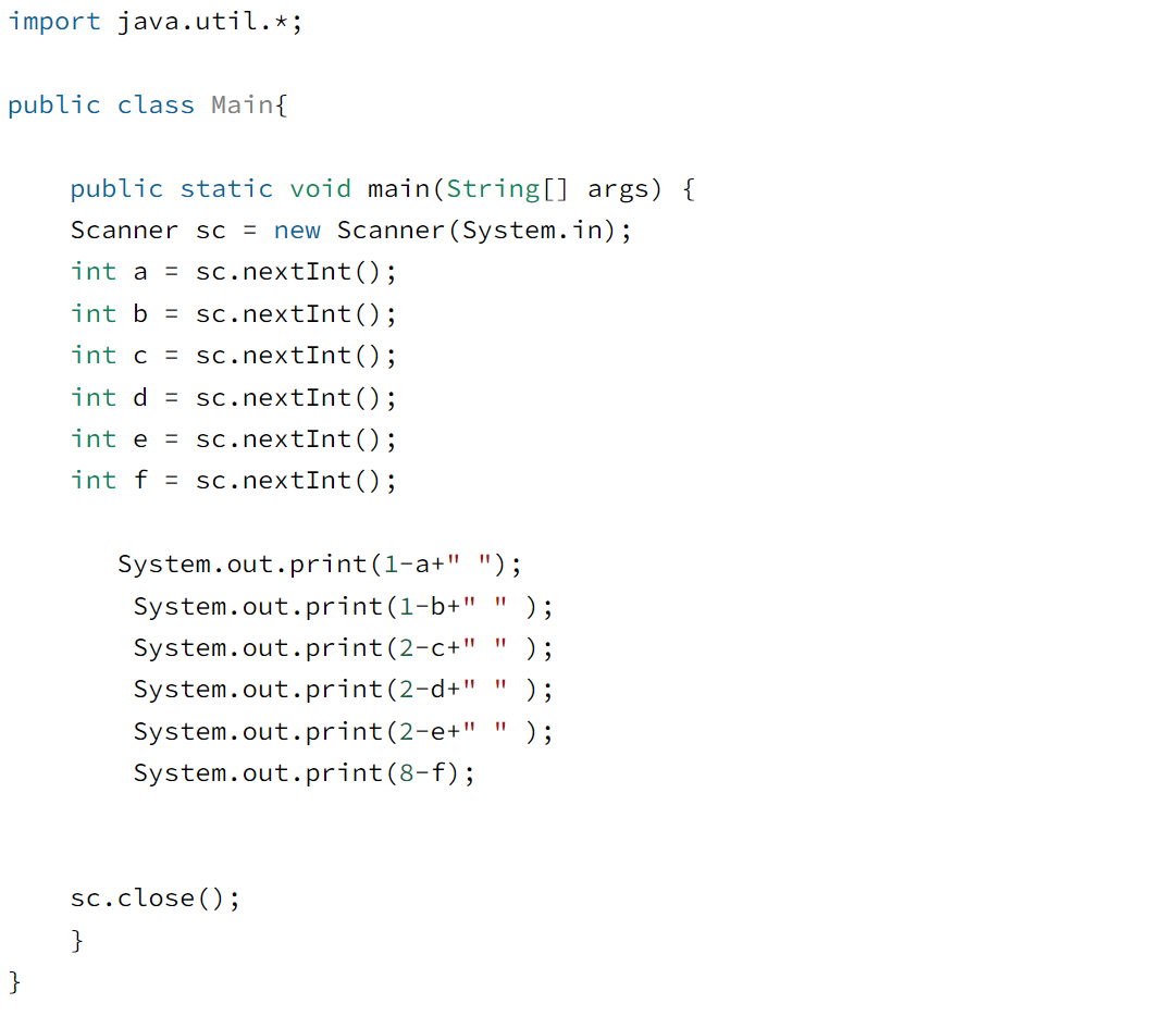 문제에서 요구하는 내용은 각 피스의 현재 존재하는 개수와 원래 구성되어 있는 피스의 개수를 비교하는 것이다.