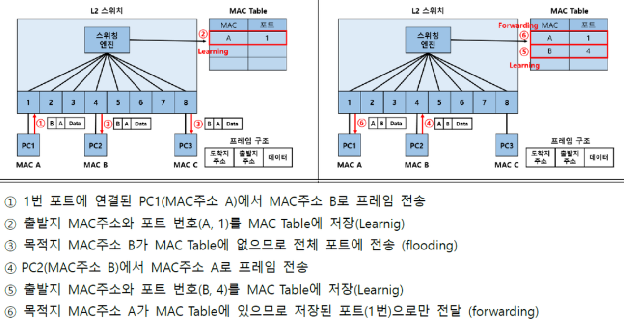 - Learning : 목적지 주소를 MAC주소와 포트를 MAC Table에 저장한다.