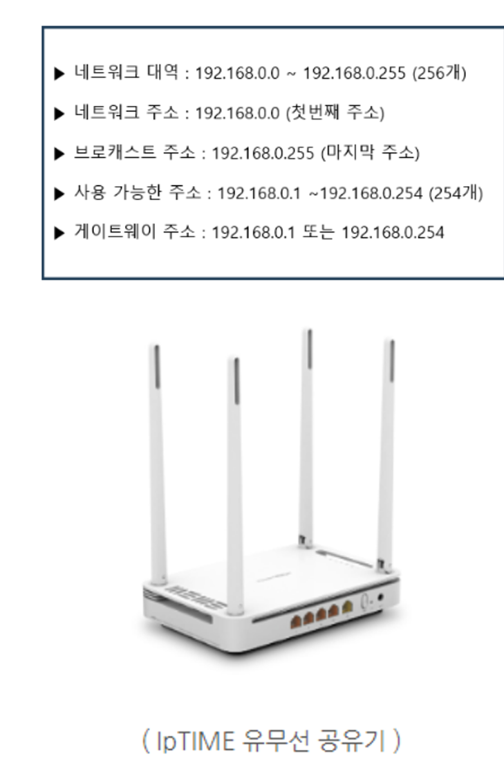 - 게이트웨이 주소는 사용자가 사용가능한 254개중 가장 첫번재 주소나 마지막 주소를 사용한다. ( 192.168.0.1 또는 192.168.0.254)
