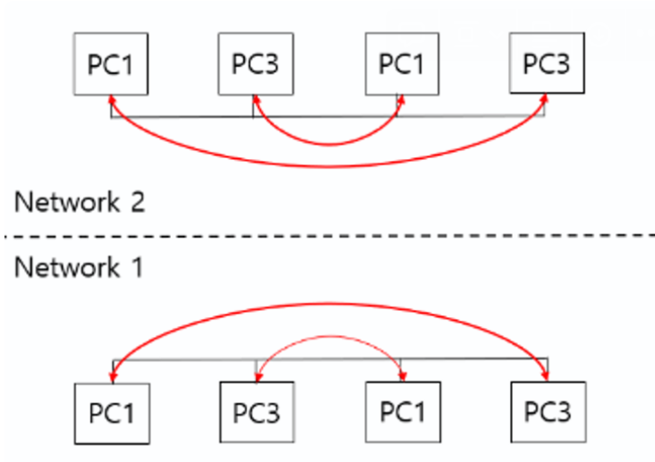 네트워크에 연결된 PC와 링크 수가 많으면 많을 수록 송수신 속도는 급격하게 하락한다.