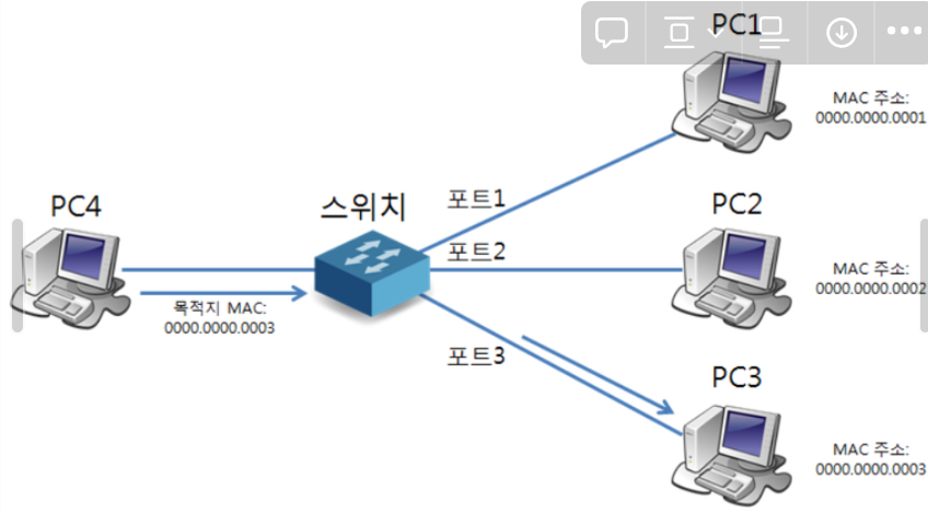 - 목적지의 MAC주소를 가지고 있는 포트에만 프레임을 전송한다.