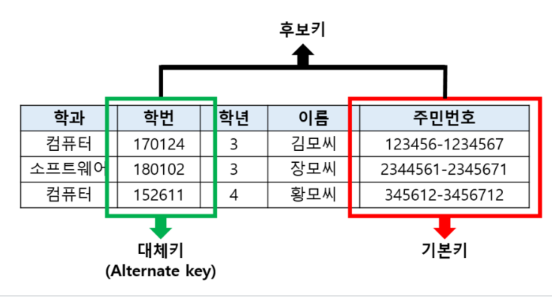 - 후보키 중에서 기본키(Primary Key)로 선택되지 않고 남은 키(Key)를 의미한다. 보