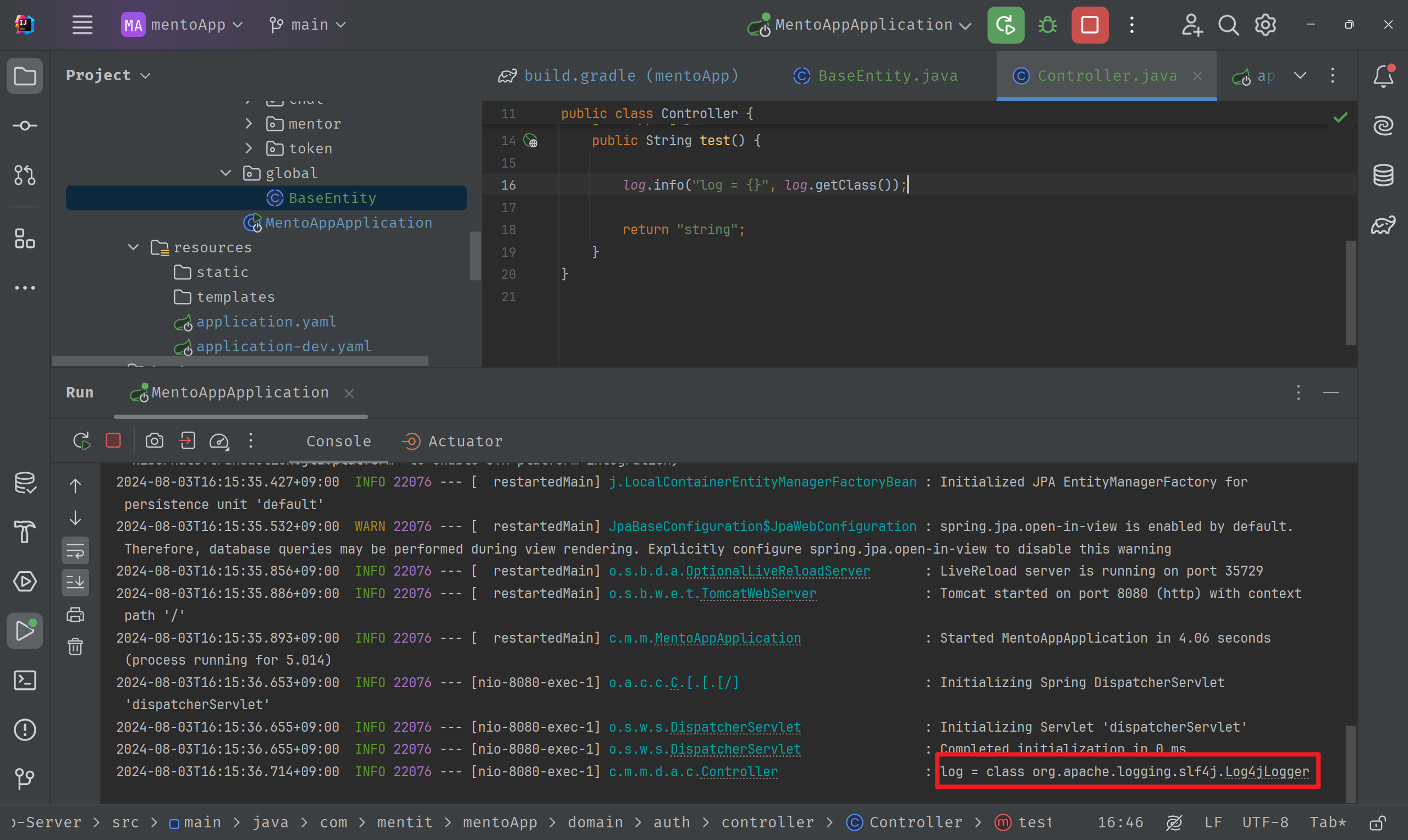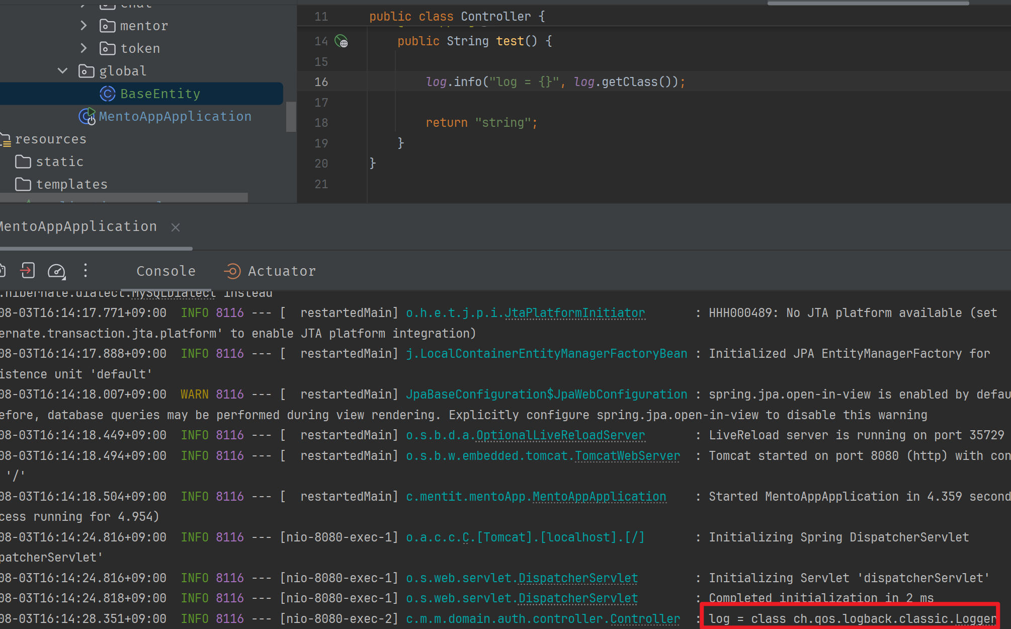 이렇게 하면 consle에서 logback으로 보이던 내용이 log4j로 변경된것을 확인할 수 있다.