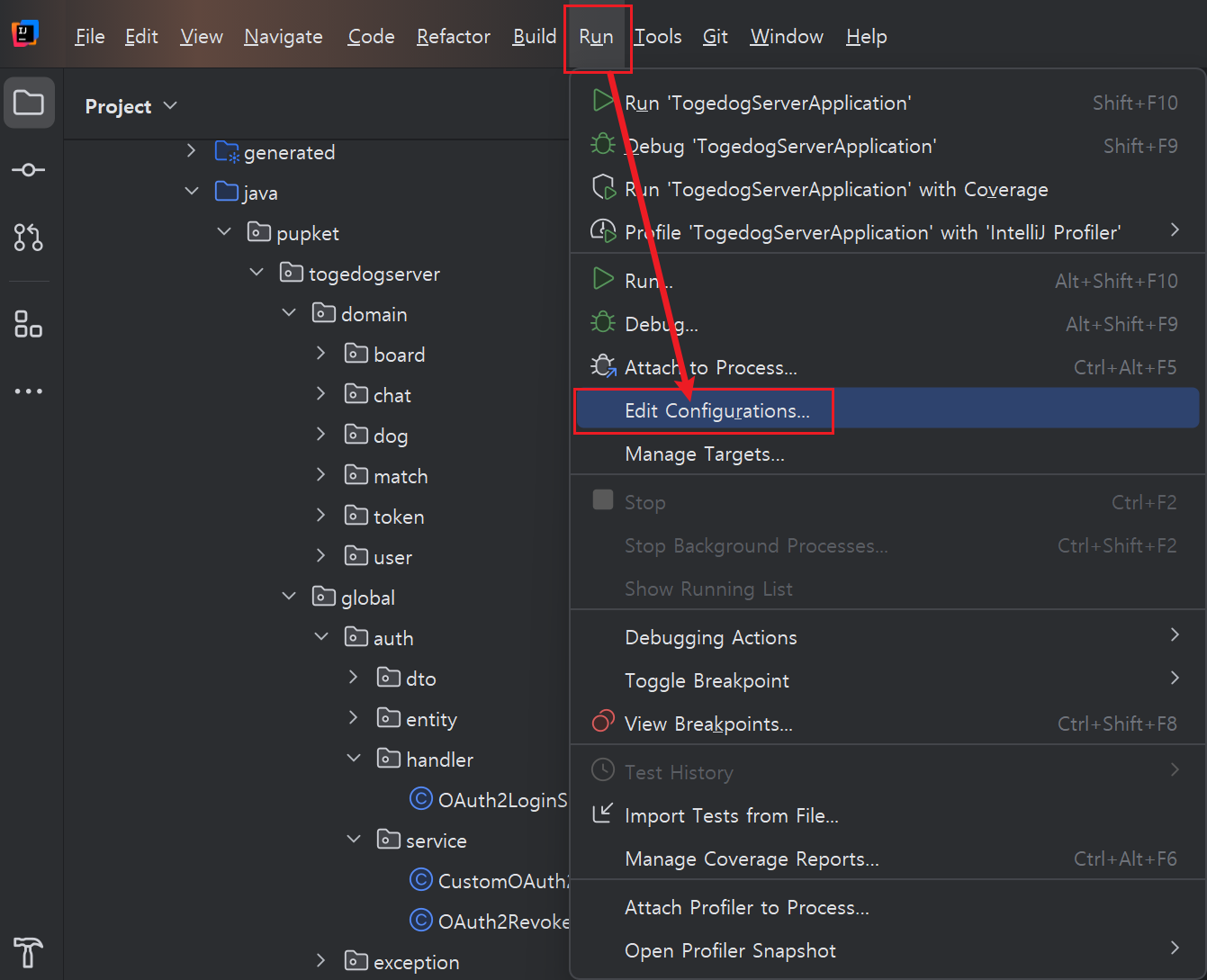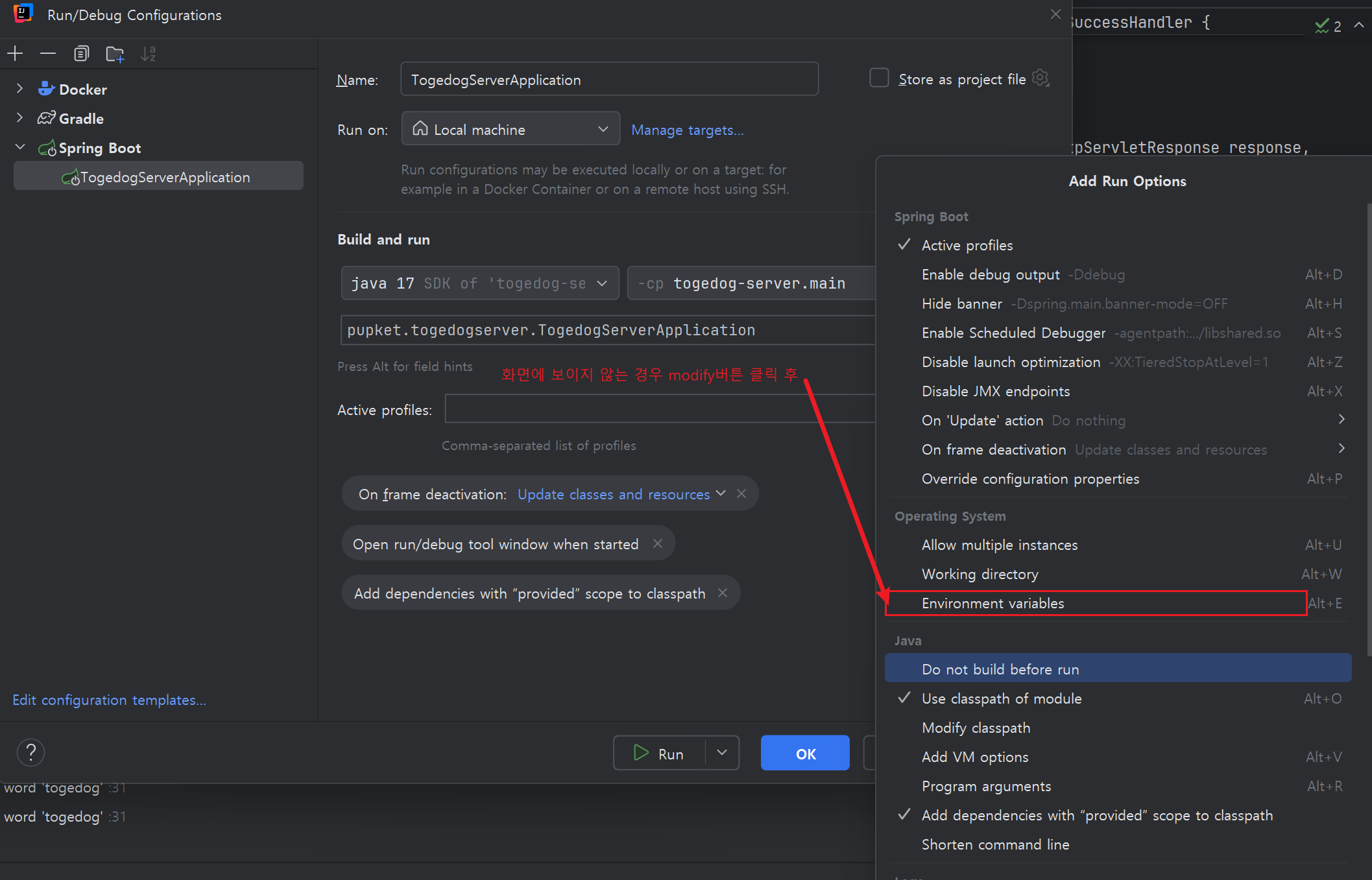 Run - Edit Configurations 클릭 - Enviroment variable에 원하는 변수를 등록해주면된다.