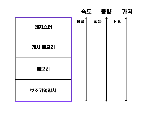 아래 그림은 위쪽이 CPU와 가장 가까운 순서이다. 레지스터 -> 캐시 메모리 -> 메모리 -> 보조메모리 순이다.
