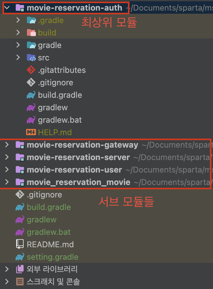movie에서 user서비스를 연결한 상태여서 user에만 모듈로 뜬 것 같다.(이건 내 뇌피셜)
