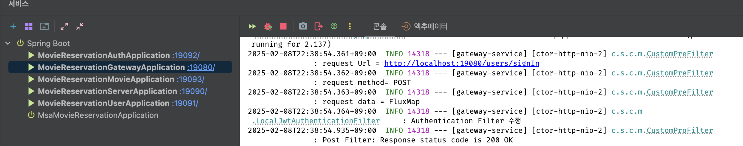 이번엔 gateway에서 설정한 필터가 잘 작동하는지 로그를 살펴보자.