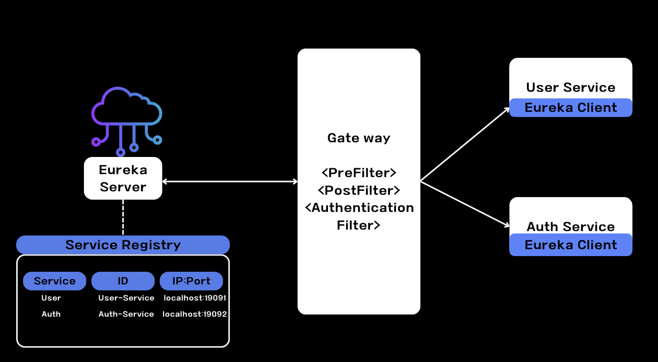 이전에는 Eureka 서버가 직접 서비스에 주소를 알려주고 통신하는 방법을 사용했다. 이 과정에서 gateway를 추가해서 들어오는 요청의 전후처리와 인증/인가를 수행할 수 있도록 설정해 보려고 한다.