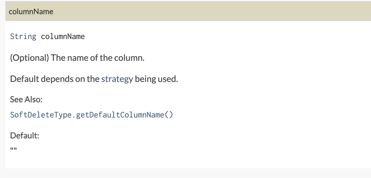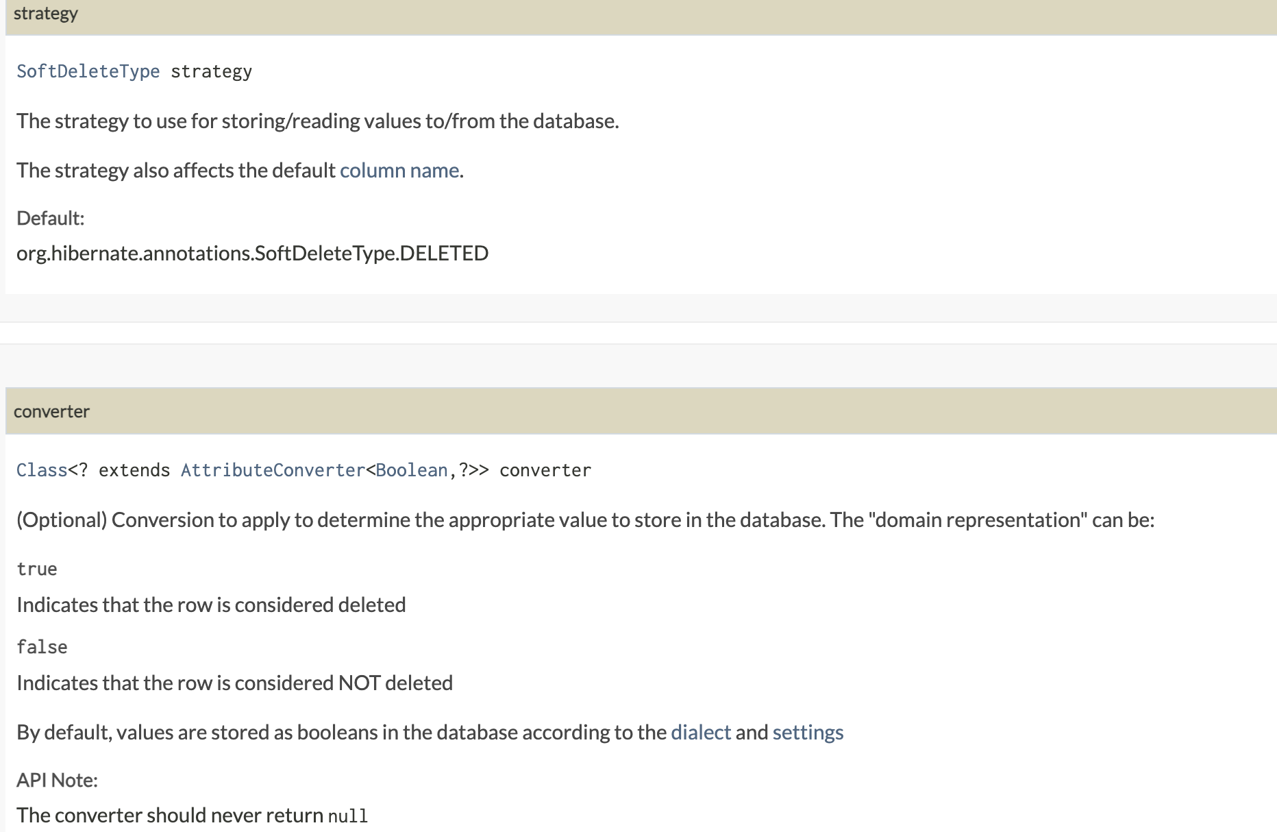 위 사진은 @SoftDelete의 속성들이다. converter를 사용할 수 있으나 Boolean 한정이고 nul을 허용하지 않는다.strategy 속성을 통해서는 DELETED, ACTIVE 전략을 사용할 수 있다.DELETED는 행이 삭제되었는지를 추적한다. true라면 삭제됨, flase는 삭제되지 않음ACTIVE는 행이 활성 상태인지 추적한다. true는 삭제되지 않은 활성상태, false라면 비활성상태를 가리킨다.
