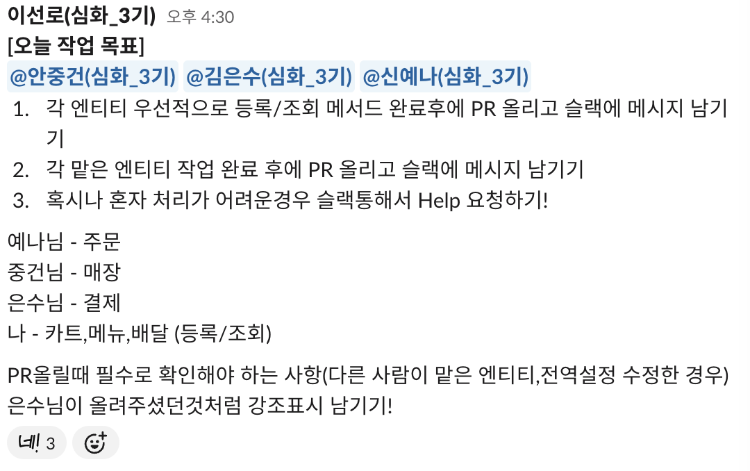 이렇게 각자 업무를 다시 분담하고 지금도 수시로 팀원들의 개발상황을 체크하고 있다.