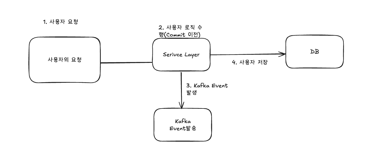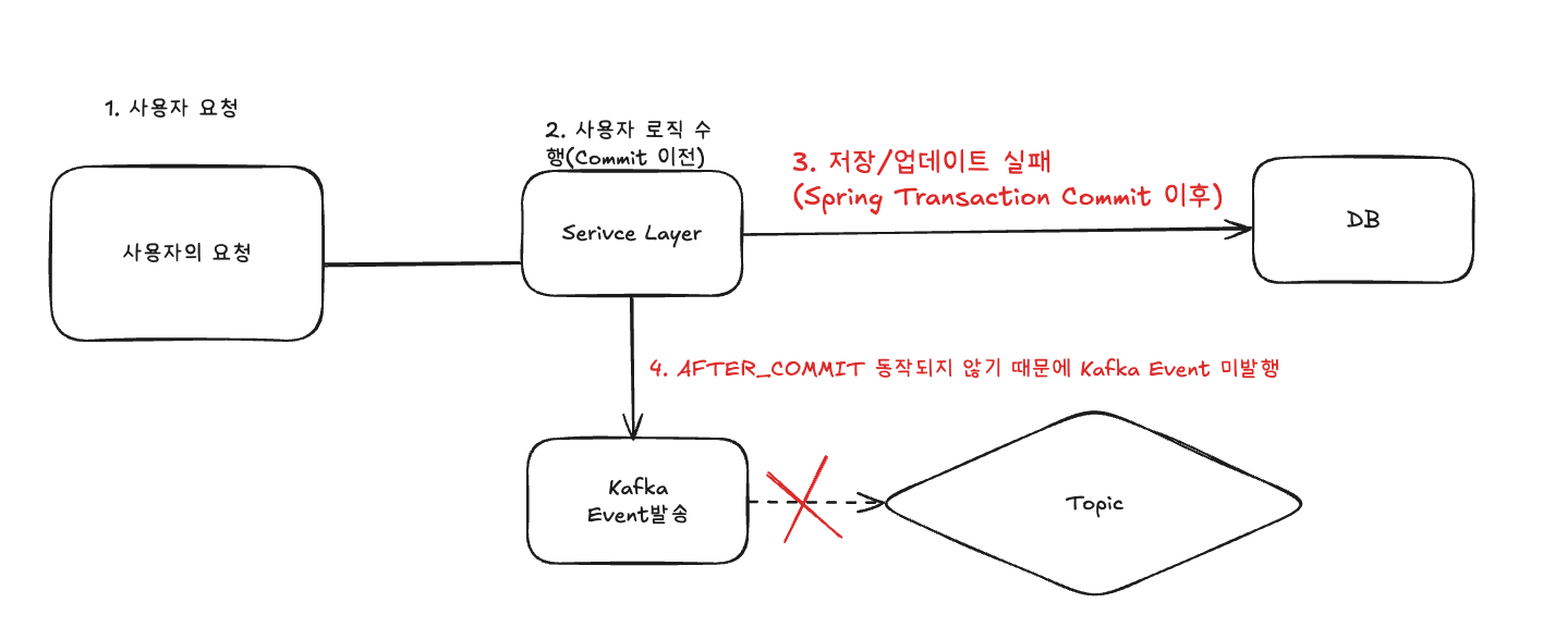 하지만 Kafka로 이벤트를 전달하는 메서드가 로직에 함께 있다면 어떻게 될까? 트랜잭션이 커밋되기 이전 시점에 카프카가 이벤트를 발생시키고 토픽을 통해 전송하게 된다.