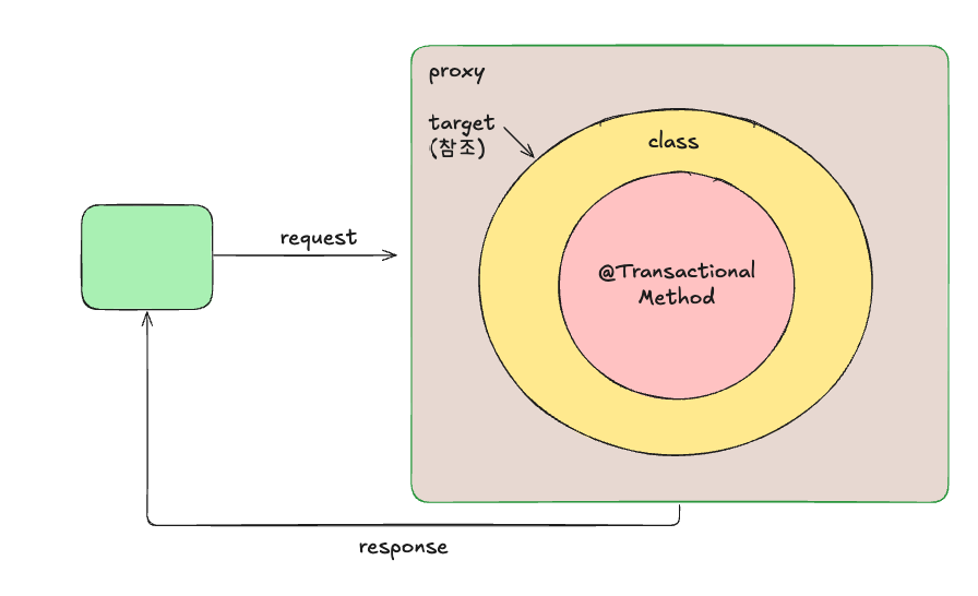 Spring에서 @Transactional이 적용된 메서드를 실행할 때 프록시 객체가 원본 객체를 감싼다는 말은 프록시 객체가 원본 객체(Target)의 실행을 대신 관리한다는 의미다.