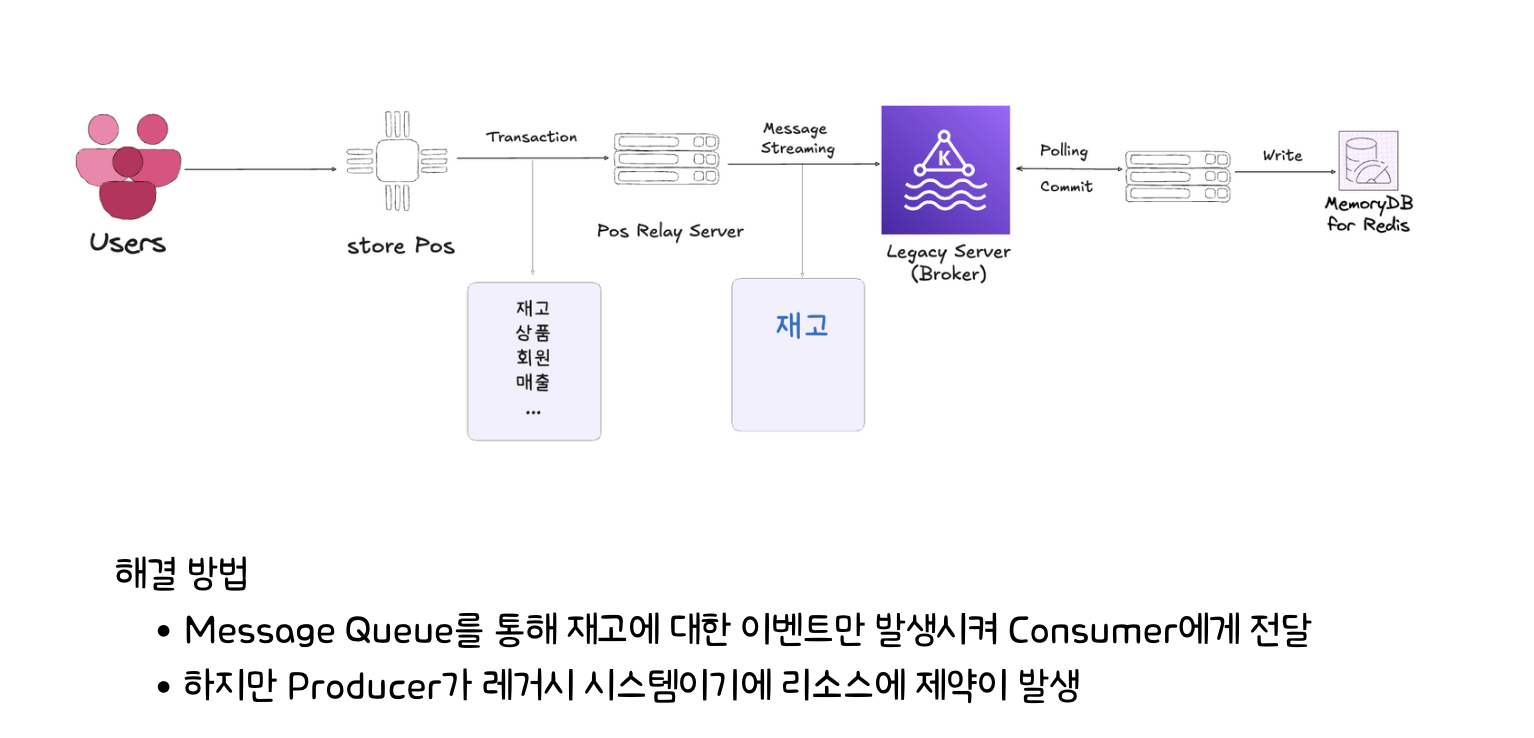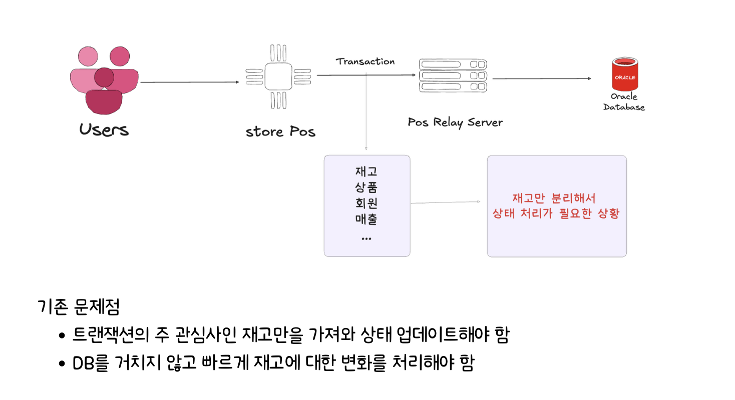 카프카 도입 이전에는 하나의 트랜잭션에 여러개의 도메인이 함께 묶여 데이터가 전송되었다. 그렇기에 재고만을 처리할 수 있는 방법이 필요했고 이를 DB를 거치지 않고 빠르게 재고에 대한 변화를 감지하고 전파할 수 있는 방법이 필요했다. DB를 거치는 방법은 파일시스템까지 접근해야 하기에 비교적 시간이 더 많이 걸리기 때문이다.