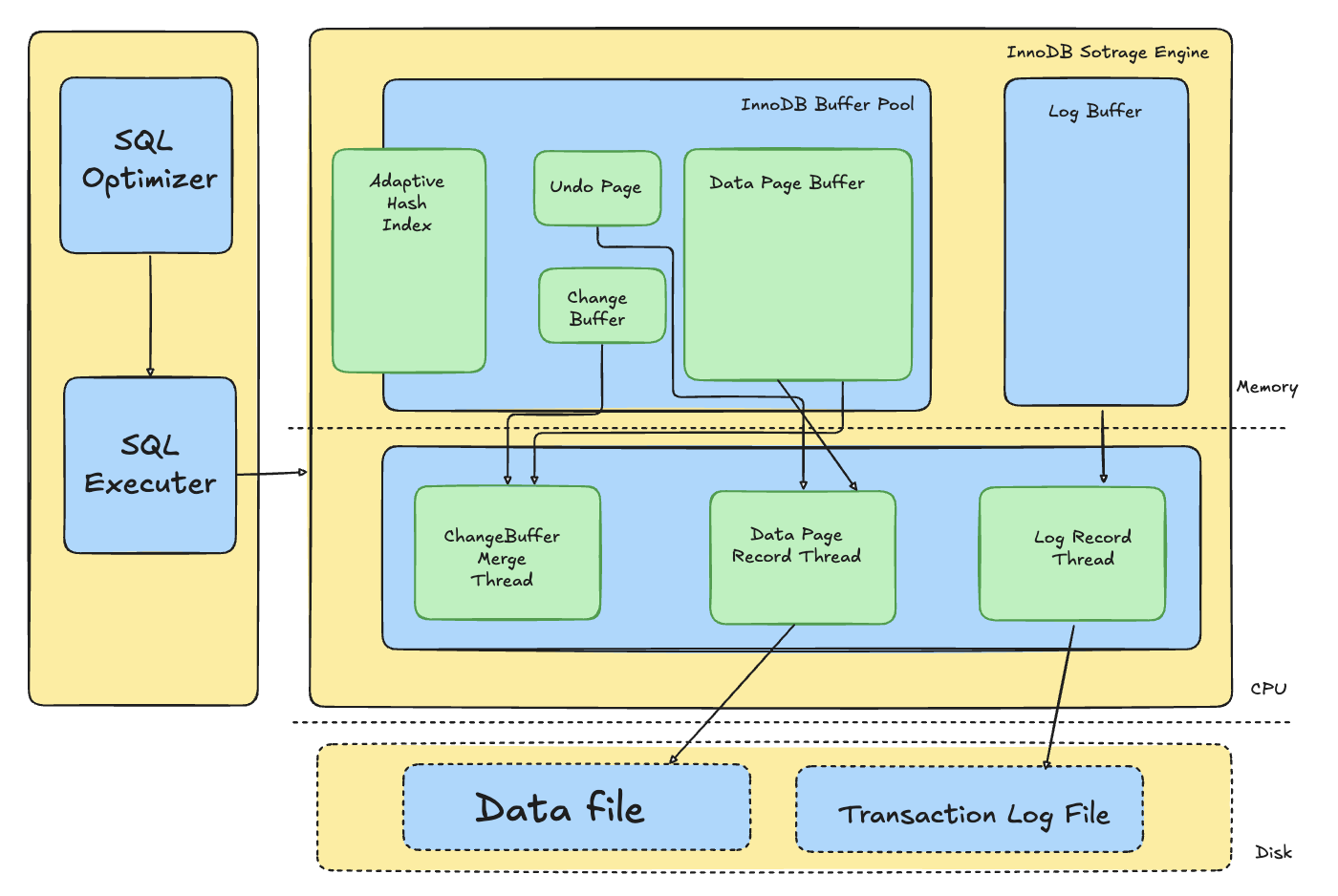 - 디스크의 데이터 파일에는 체크포인트나 InnoDB의 Write 쓰레드에 의해 새로운 값으로 업데이트 돼 있을 수도 있고 아닐 수도 있다. InnoDB가 ACID를 보장하기 때문에 일반적으로 InnoDB의 버퍼 풀과 데이터 파일은 동일한 상태라고 볼 수 있다.
