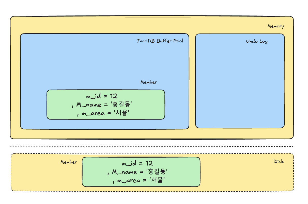 - Update 문장이 실행되면 커밋 실행 여부와 관계없이 InnoDB의 버퍼 풀은 새로운 값인 '경기'로 업데이트 된다.