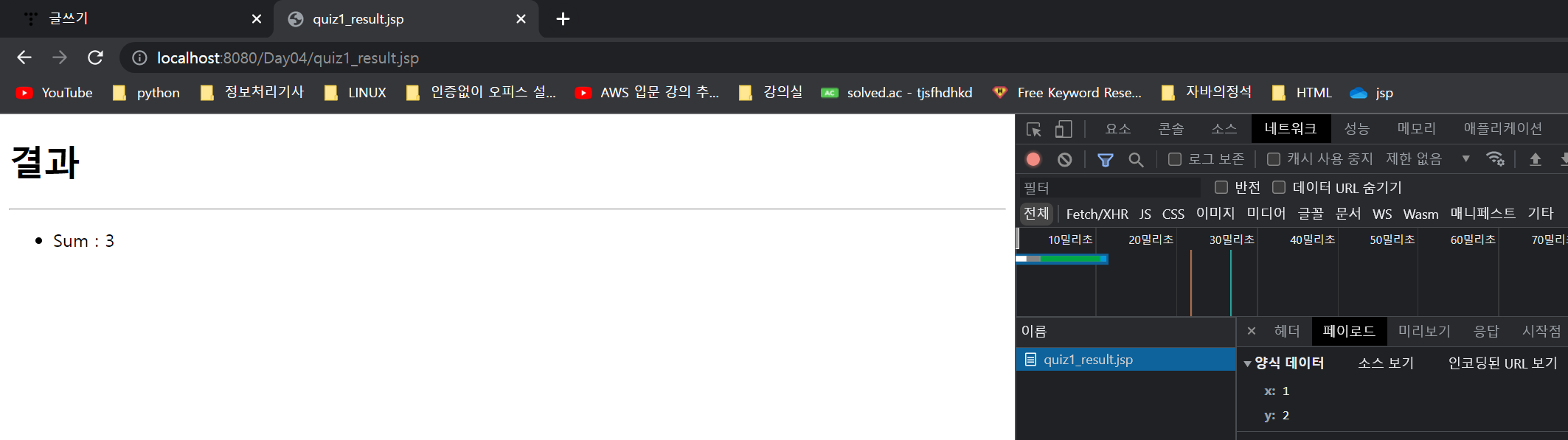 이번에는 주소창에 파라미터의 값이 보이지 않는다. 이러한 방식이 POST방식이며 GET보다 안전하게 내용을 전송할 수 있다.